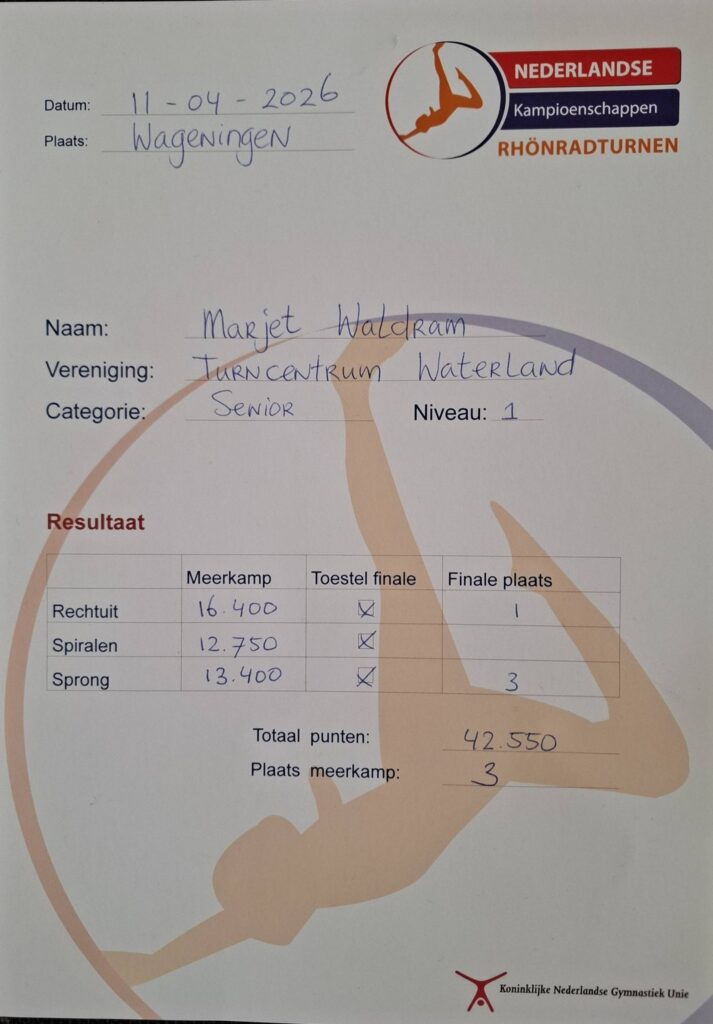 Marjet Nederlands Kampioen op onderdeel rechtuit en mag door naar WK rhönradturnen 2026.