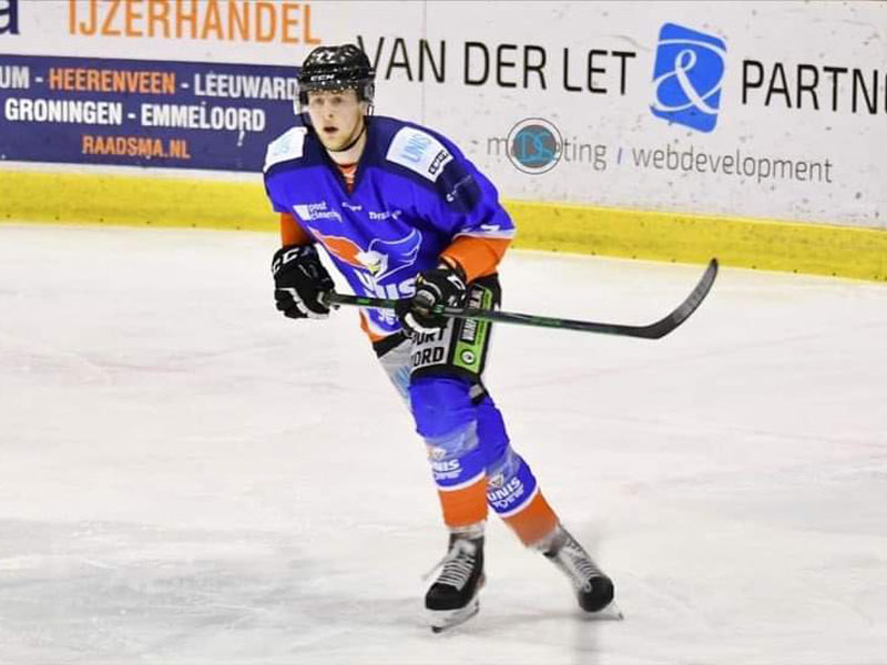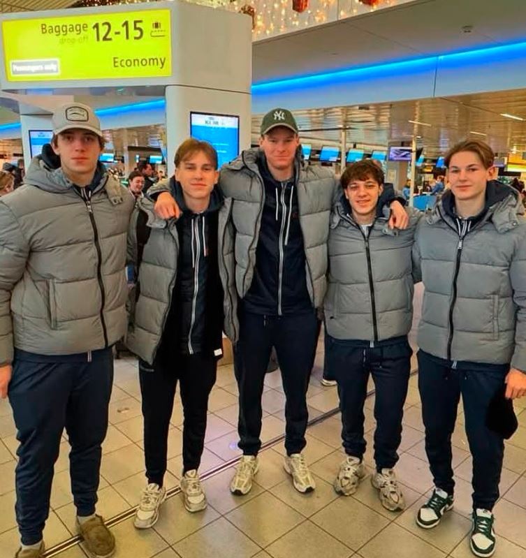 IJshocker Stijn Andringa (rechts) gaat samen met Christopher. Thijs, Jorma, Luka komende week spelen tijdens WK U20 in Zagreb. Maandag is de eerste wedstrijd nu is de ploeg op Schiphol voor vertrek.