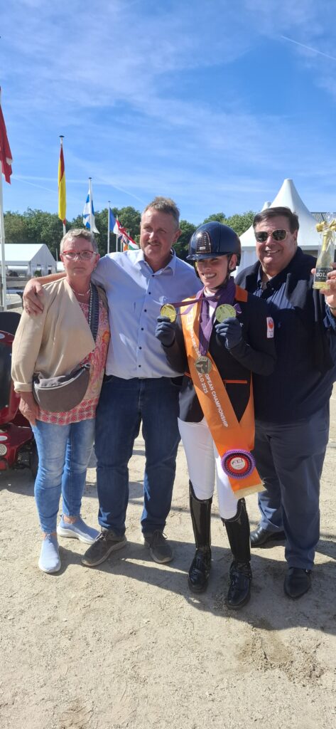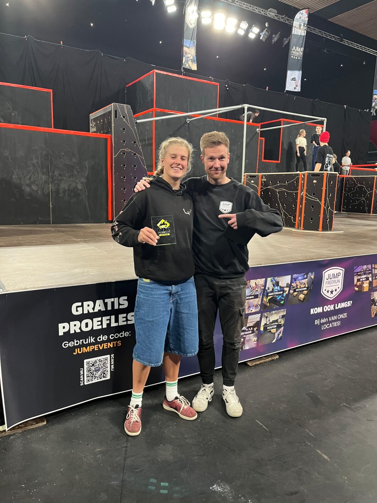 Madelief traint bij Jump Freerun Noord in Heerenveen, onder begeleiding van haar coach Thomas Dijkmeijer, met wie ze ook op de foto staat.
